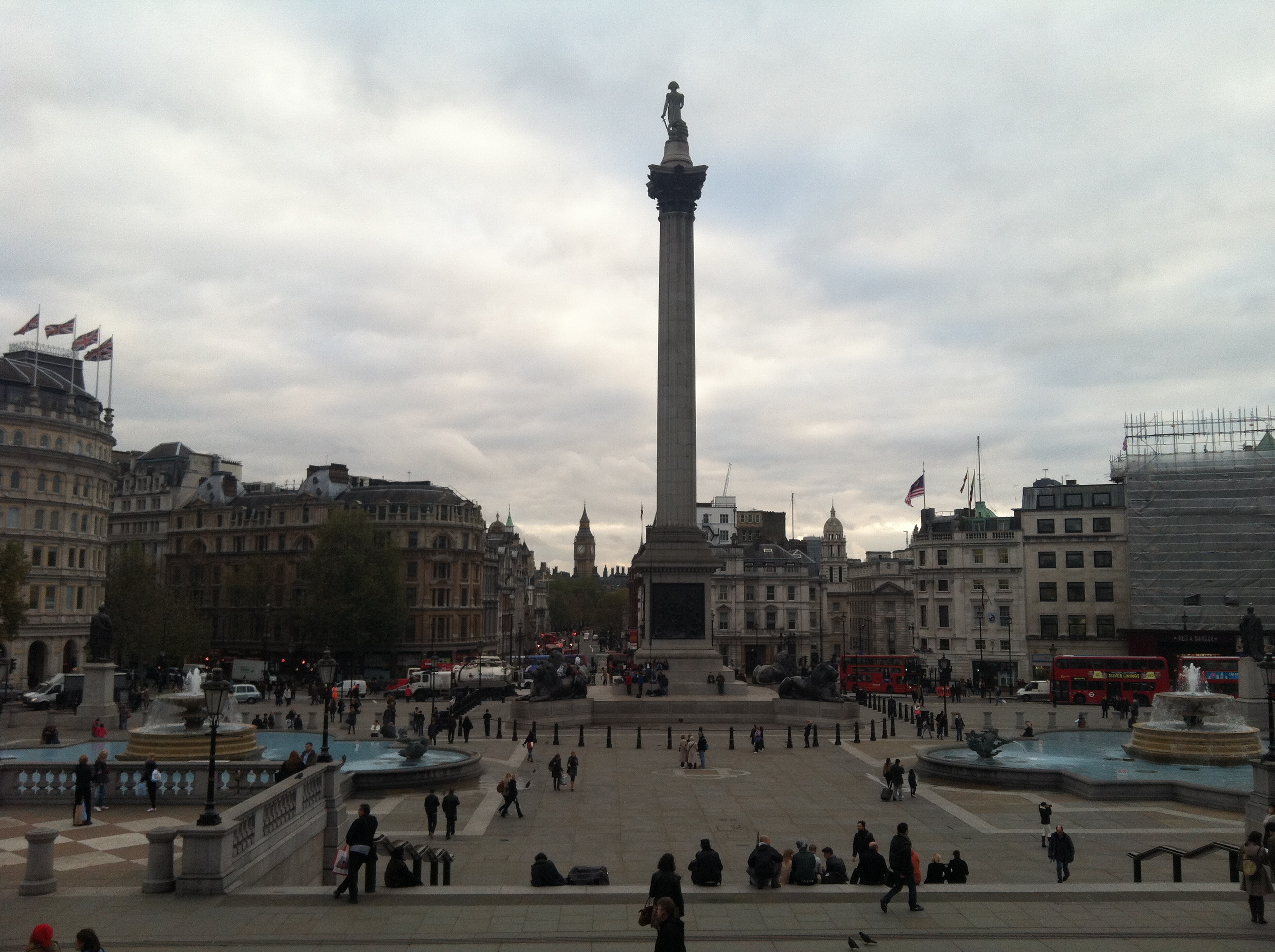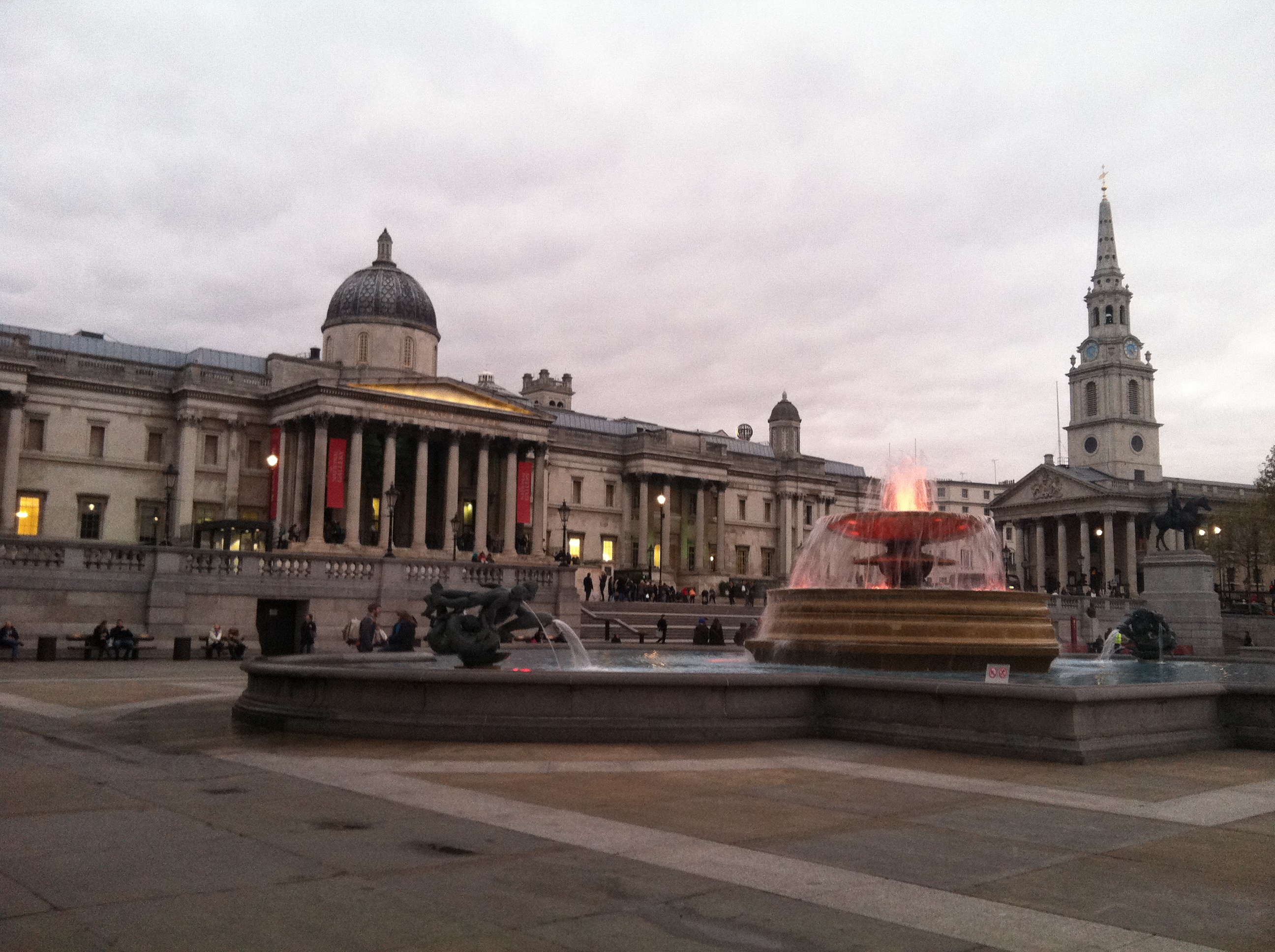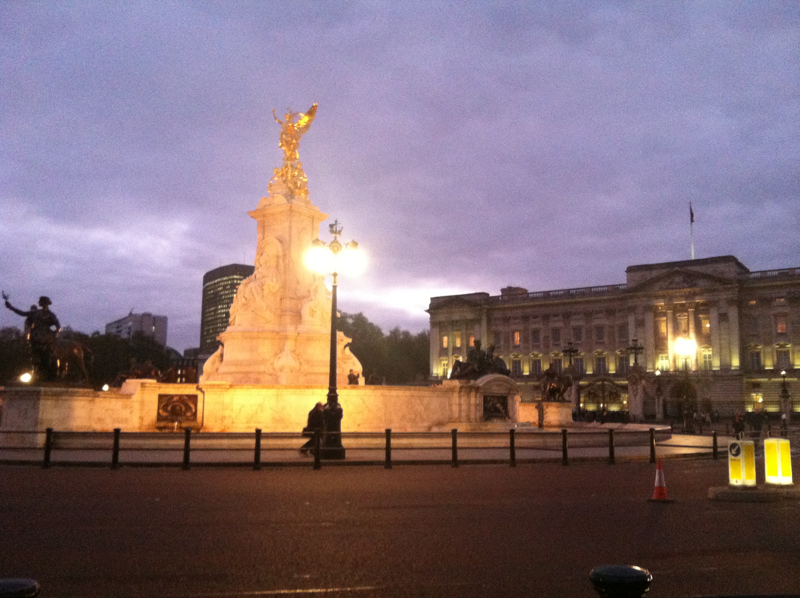 I think that walking is the best way to explore any place, especially a new place. Today, I walked over ten miles, alone, on my own two feet. Here is the end of the day, the sun setting on Trafalgar Square and nearby Buckingham Palace.