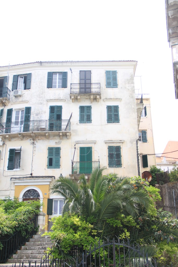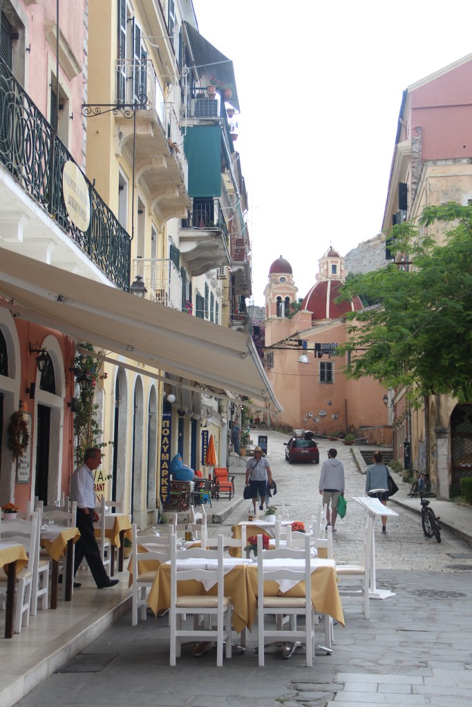 After we arrived in Corfu’s new port about 40 minutes later, we walked toward the direction of the Old Town, and paid to leave our luggage along the way, before stopping for lunch at a small place across from the water for tzatiki, a local potato/garlic sauce, rose wine, octopus in vinegar, and a gyro. And then, we wandered for three hours. We stopped for coffee (frappes – my first) and for the local Kumquat liquor (so good – we bought some to take home duty free). It was a typical tourist village, full of food and shops. I stopped to buy a pair of leather sandals at one point, since I knew I needed a new pair for the summer. We chatted with the shopkeeper for a bit, a really nice girl from Athens, studying in Corfu. Later, I talked with another shopkeeper, this one selling Turkish cotton products, and purchased one of her drawstring bags that I loved. She was also so nice; I remember her very interesting accent. She said she studied English in Scotland, but was born in Corfu.