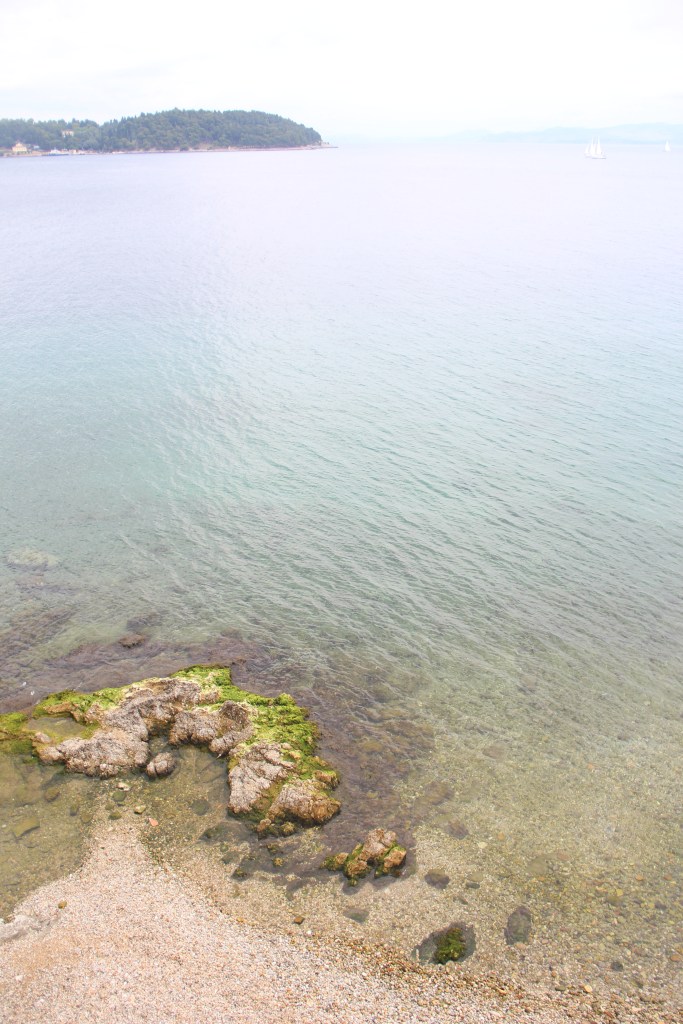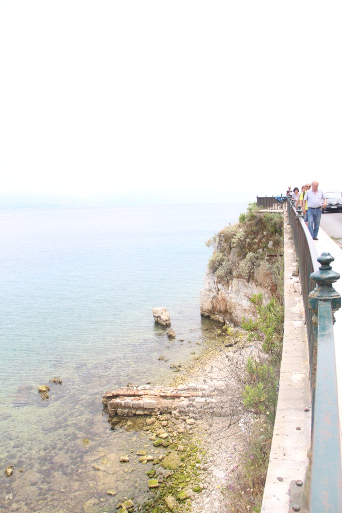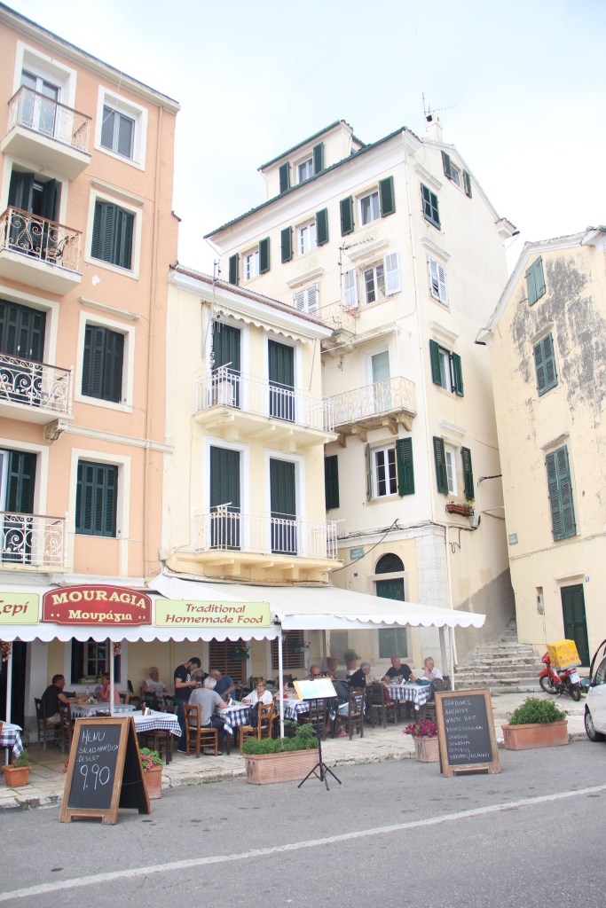After we arrived in Corfu’s new port about 40 minutes later, we walked toward the direction of the Old Town, and paid to leave our luggage along the way, before stopping for lunch at a small place across from the water for tzatiki, a local potato/garlic sauce, rose wine, octopus in vinegar, and a gyro. And then, we wandered for three hours. We stopped for coffee (frappes – my first) and for the local Kumquat liquor (so good – we bought some to take home duty free). It was a typical tourist village, full of food and shops. I stopped to buy a pair of leather sandals at one point, since I knew I needed a new pair for the summer. We chatted with the shopkeeper for a bit, a really nice girl from Athens, studying in Corfu. Later, I talked with another shopkeeper, this one selling Turkish cotton products, and purchased one of her drawstring bags that I loved. She was also so nice; I remember her very interesting accent. She said she studied English in Scotland, but was born in Corfu.