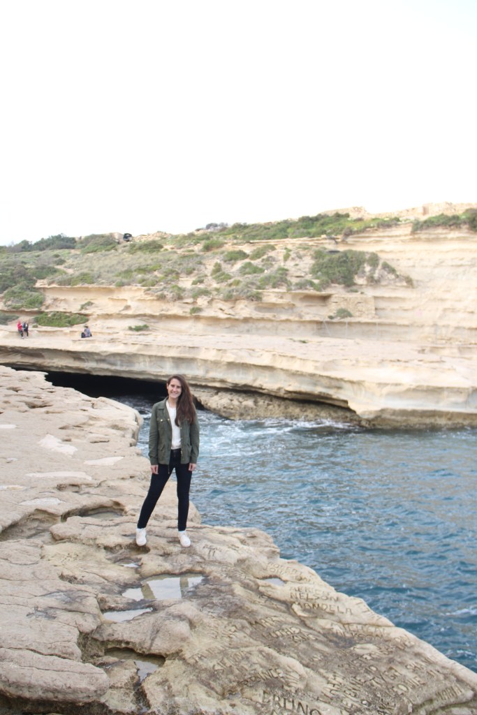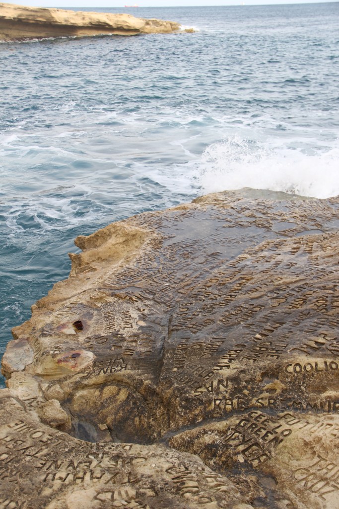 St. Peter’s Pool, our final stop in Malta, a quick peak enroute to the airport via Marsaxlokk. In the summer, the stones are barely visible beneath the bodies, the sea overflowing with bathers. But in late February, it was entirely ours. Celebrity names carved in stone, sea spray, and all.