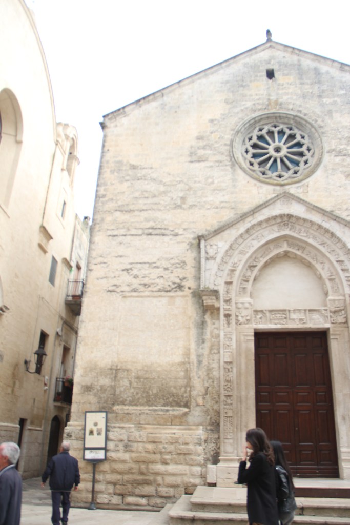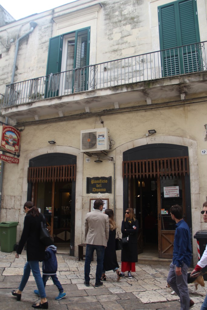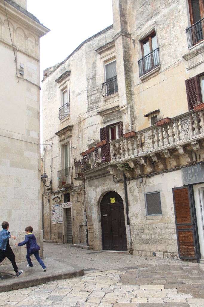 Altamura, Old Town, an entire population crowded in the square for Sunday socializing. Everyone at a bar or café. We ate bread and focaccia on the fountain, watched the kids on skateboards and the people walking.