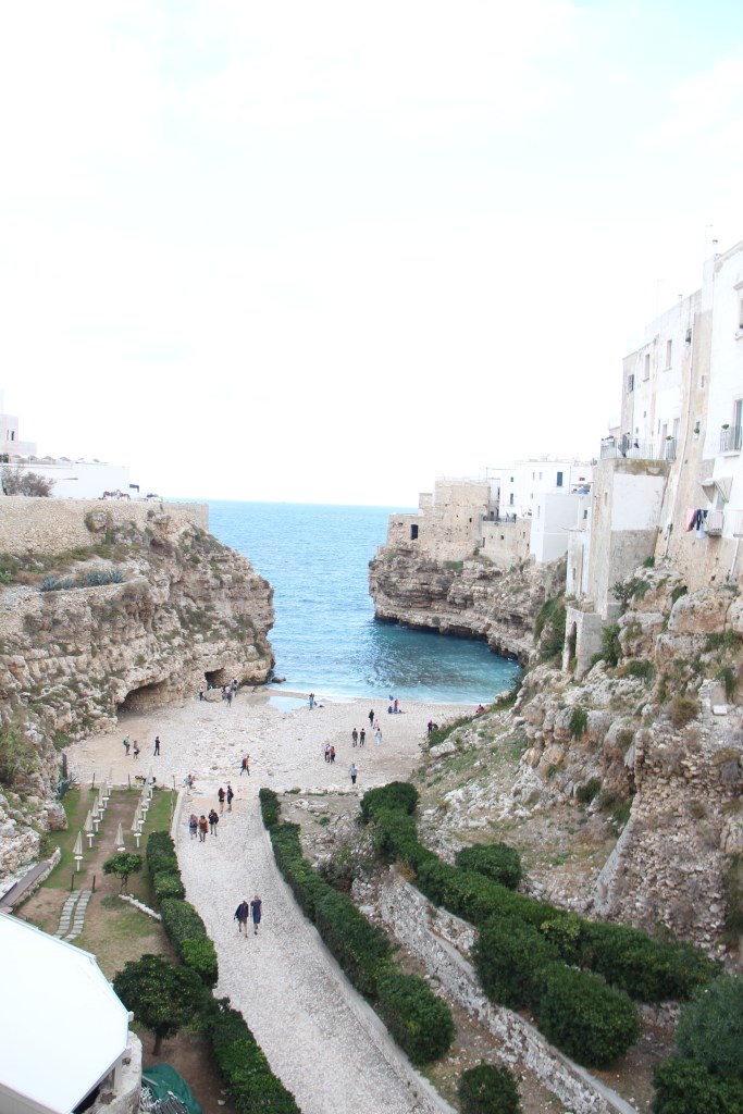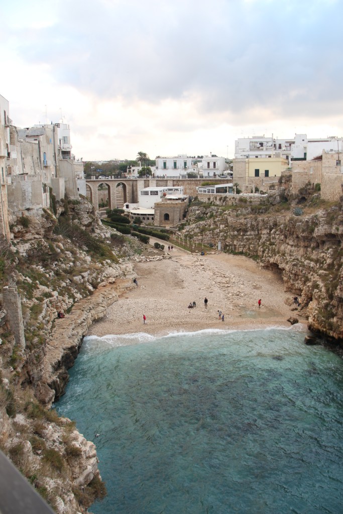 First glimpse of the iconic beach – rocky, wedged between two cliffs, wedged between what might as well be abandoned castles. Then, under the bridge, eying its Roman structure, on to the sand. There were other people, not too many – some swimming, some in winter coats and boots.I couldn’t count all the shades of turquoise, deep blue. We could see how violent the waves were.
