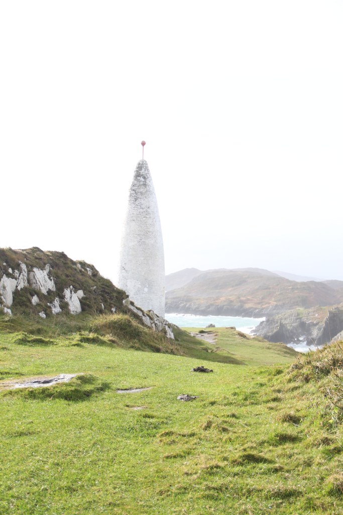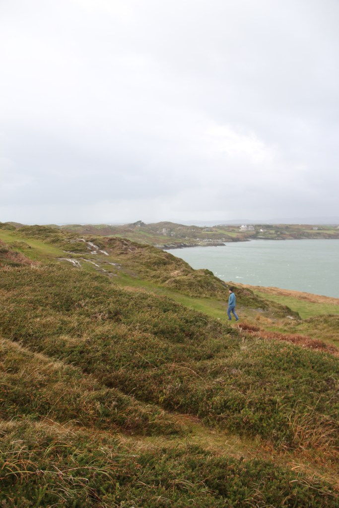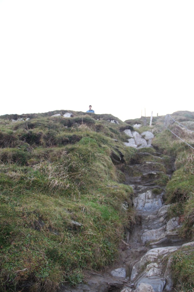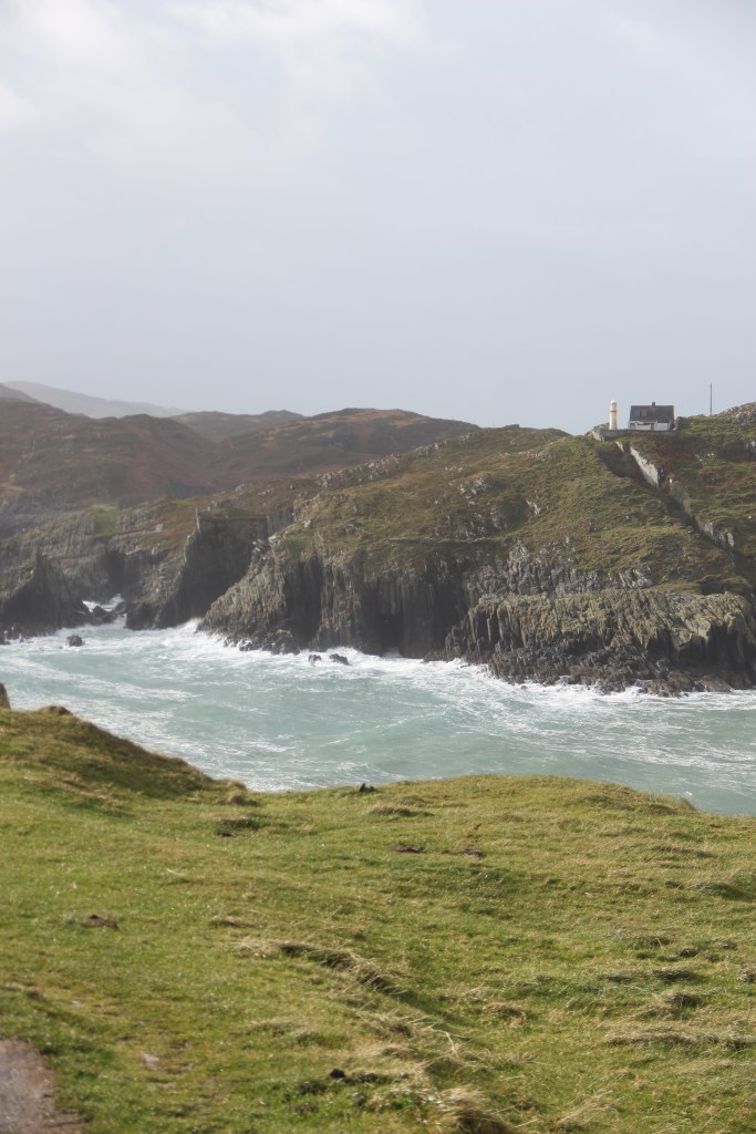 Pouring and windy most of the morning. Poured the entire drive, but stopped when we arrived at the beacon. Sun poked out, casting bright light across the wild, bright, green grass. We climbed steep, slipping rocks to the top. Real, rugged, untameable Ireland. There was a small lighthouse across the water, atop an adjacent cliff. The waves crashed furiously. The views were breathtaking. I could have blown away.