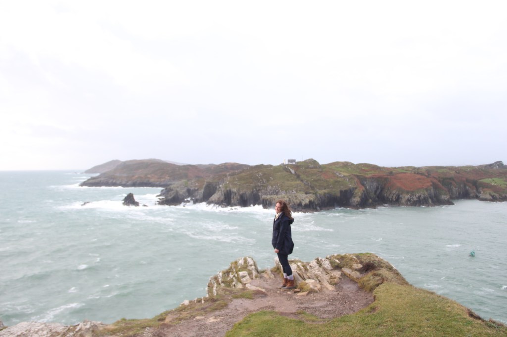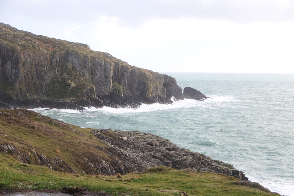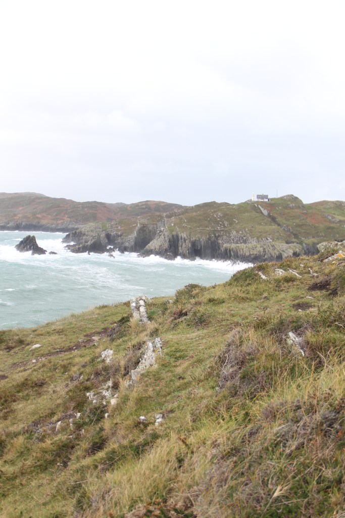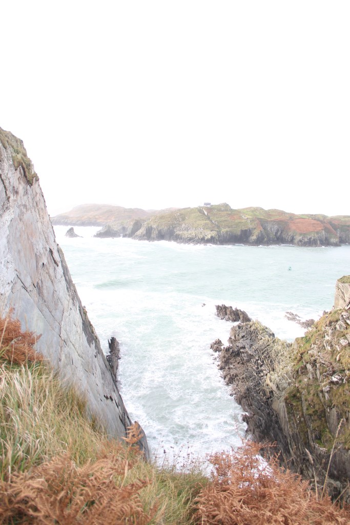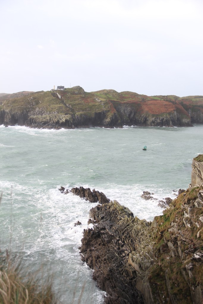 Pouring and windy most of the morning. Poured the entire drive, but stopped when we arrived at the beacon. Sun poked out, casting bright light across the wild, bright, green grass. We climbed steep, slipping rocks to the top. Real, rugged, untameable Ireland. There was a small lighthouse across the water, atop an adjacent cliff. The waves crashed furiously. The views were breathtaking. I could have blown away.