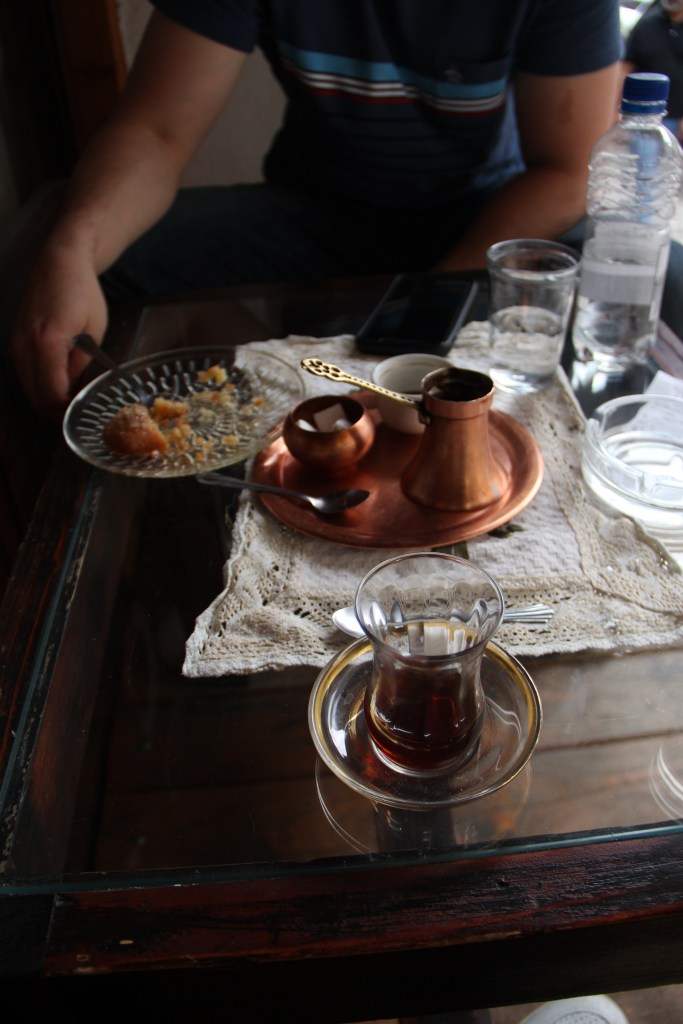 Later, we visited a war photography exhibition next to Stari Most. Here, photos of the city during the war taken by a New Zealand journalist are on display, including a photo of the complete destruction of the now iconic bridge. The entire exhibit was simple, which only emphasized its power. It was only us and one other pair inside. We sat for a moment on the pillows in the little self-service cafe on site, watching the bridge jumpers up close, until we left and found stools on the street at a nearby cafe to sit at for Turkish coffee, Turkish tea, and a delish Turkish Delight. Time here is slow. It feels like another world entirely.