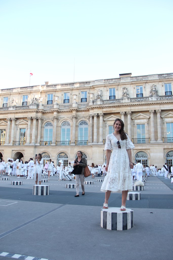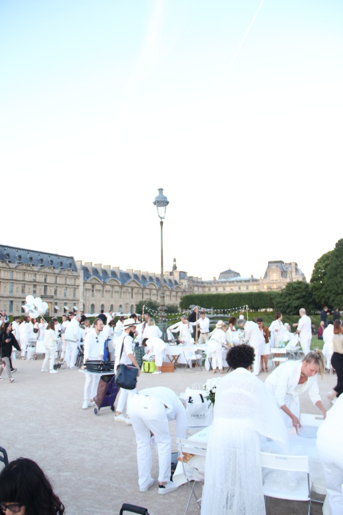 It was late afternoon when we began the return journey to Marais to find food from the market for dinner. That night, we were going to Dîner en Blanc, a spontaneous pop-up all-white dinner at a to-be-determined location with 10,000 people from all over the world. It’s an annual Parisian summer tradition. Attending Dîner en Blanc requires that you bring your own food – and table, chairs, china, table cloth, table decor, etc. For our meal, we bought pasta dinner from an Italian vendor at the market in Marais, along with cheese, wine, bread, and pastries from various other local shops. Then, a quick stop at home to change into all white before heading to a location near the Louvre to pick up our pre-ordered table and chairs before meeting our group at Palais-Royal.