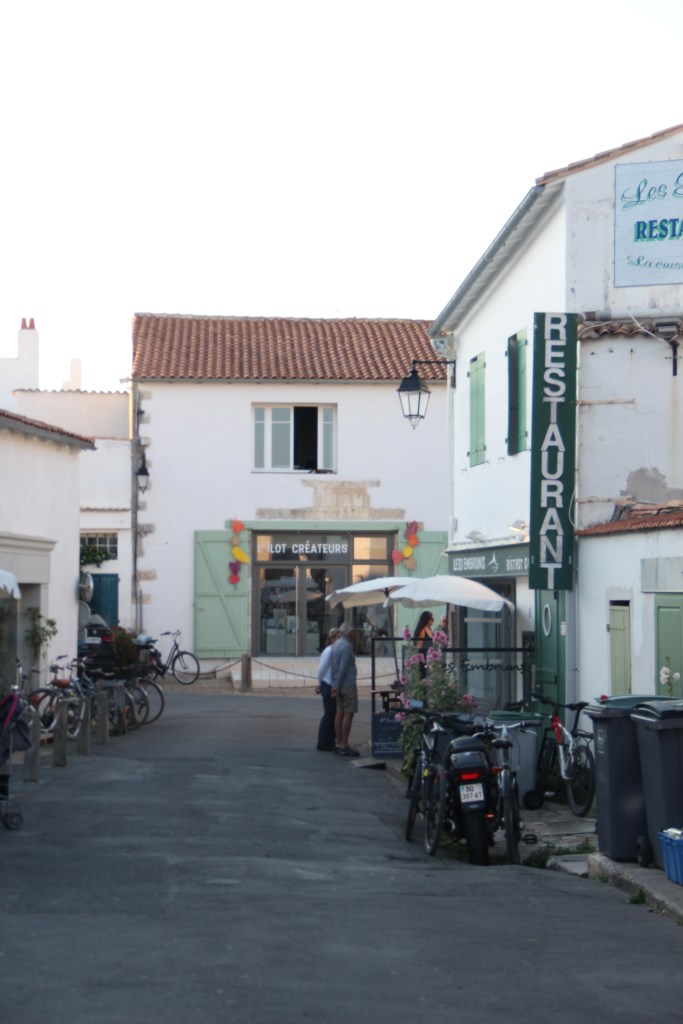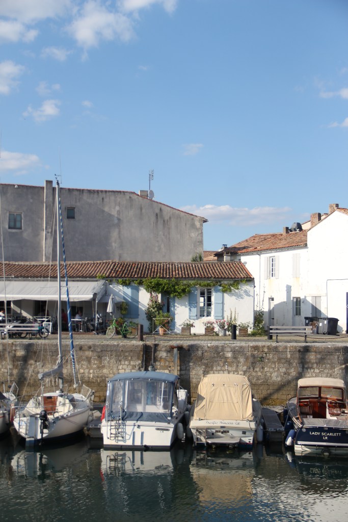 Bastille Day, la Fête nationale, my birthday eve, and the day we arrived at La Rochelle airport on mainland France just after 5:30 in the evening. We retrieved our hands-free baggage from the belt and, shortly after that, boarded the bus over the bridge to the island. It took us about forty minutes with stops to get to Saint-Martin-de-Ré, the harbor town where we would base ourselves for the next two nights. The bus, while longer than a taxi, was easy. There’s absolutely no reason to have a car on Île de Ré; plus, the fees to take a car over the bridge, I read, are high. After getting off at our stop, it took us about another ten minutes to walk down the sidewalks into the center of town and to our Airbnb. Everything, instantly, was perfect. After putting our bags inside, we immediately went to the harbor to explore it and it’s îlot.