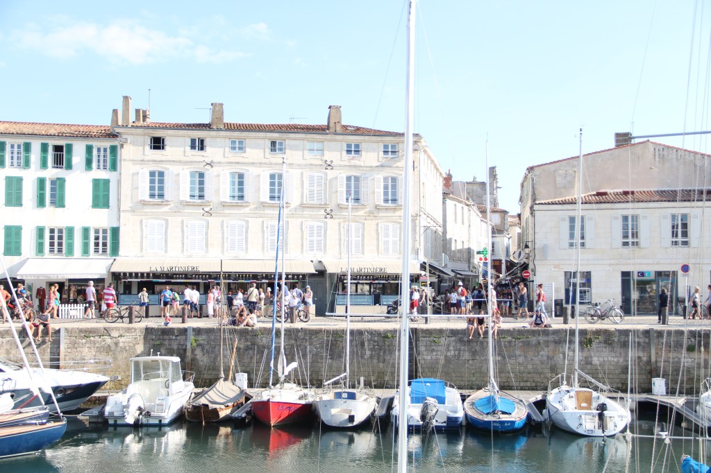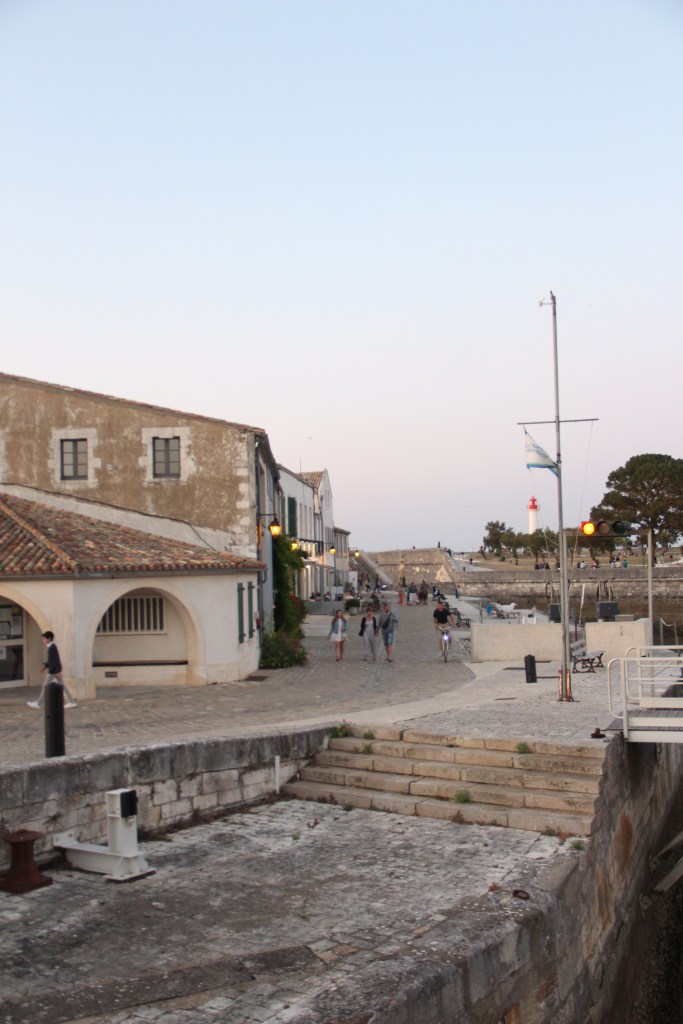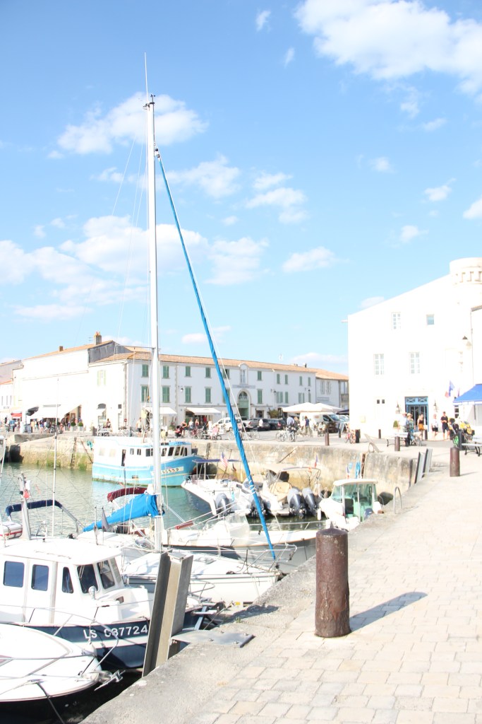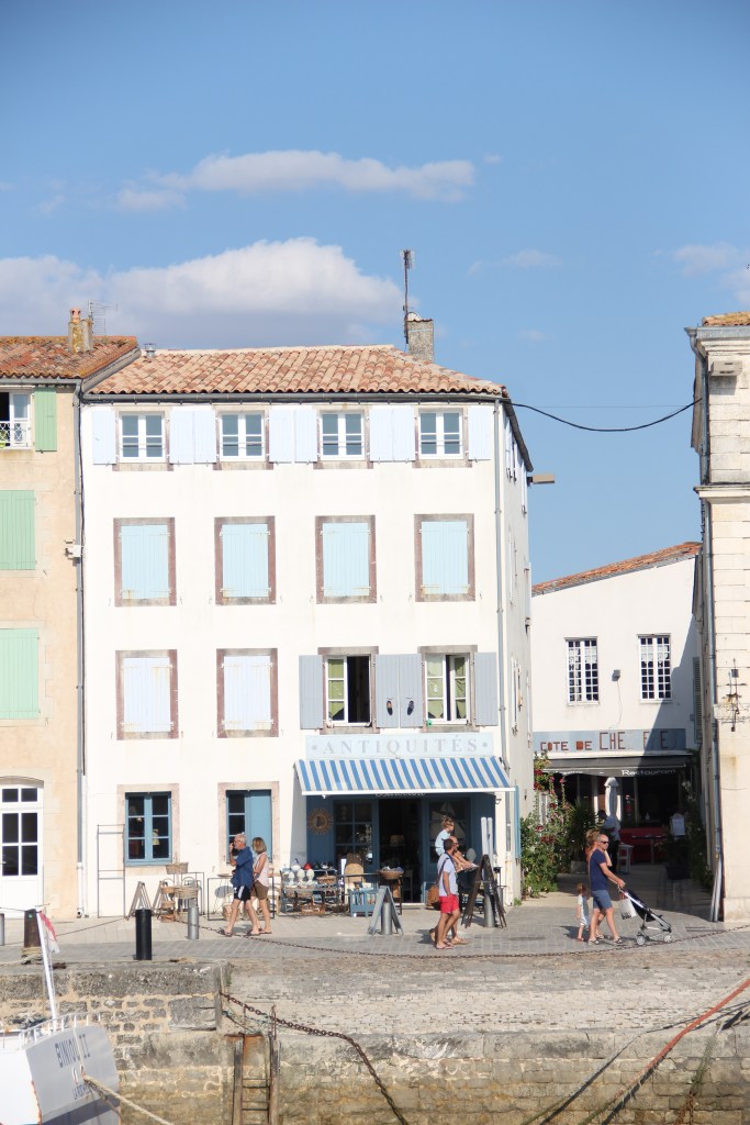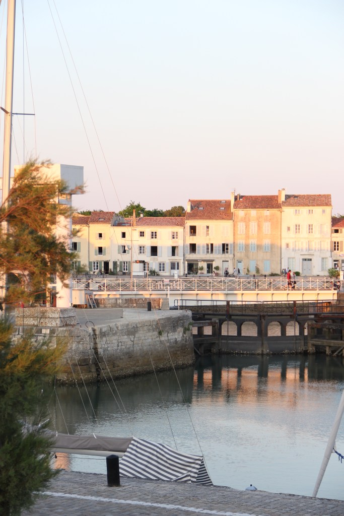 Bastille Day, la Fête nationale, my birthday eve, and the day we arrived at La Rochelle airport on mainland France just after 5:30 in the evening. We retrieved our hands-free baggage from the belt and, shortly after that, boarded the bus over the bridge to the island. It took us about forty minutes with stops to get to Saint-Martin-de-Ré, the harbor town where we would base ourselves for the next two nights. The bus, while longer than a taxi, was easy. There’s absolutely no reason to have a car on Île de Ré; plus, the fees to take a car over the bridge, I read, are high. After getting off at our stop, it took us about another ten minutes to walk down the sidewalks into the center of town and to our Airbnb. Everything, instantly, was perfect. After putting our bags inside, we immediately went to the harbor to explore it and it’s îlot.