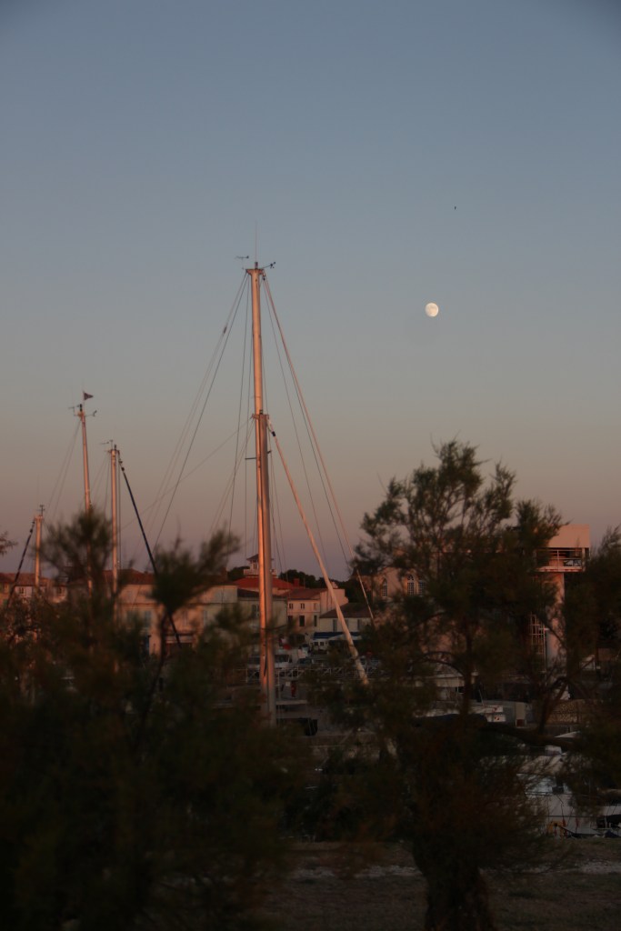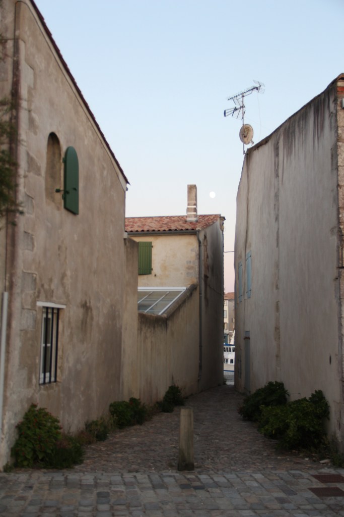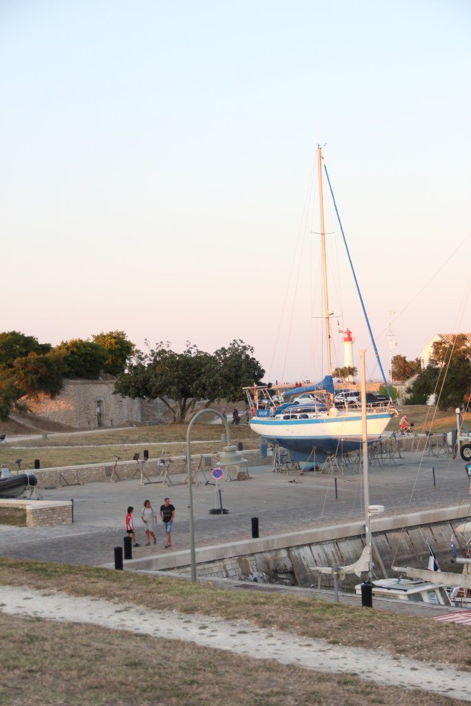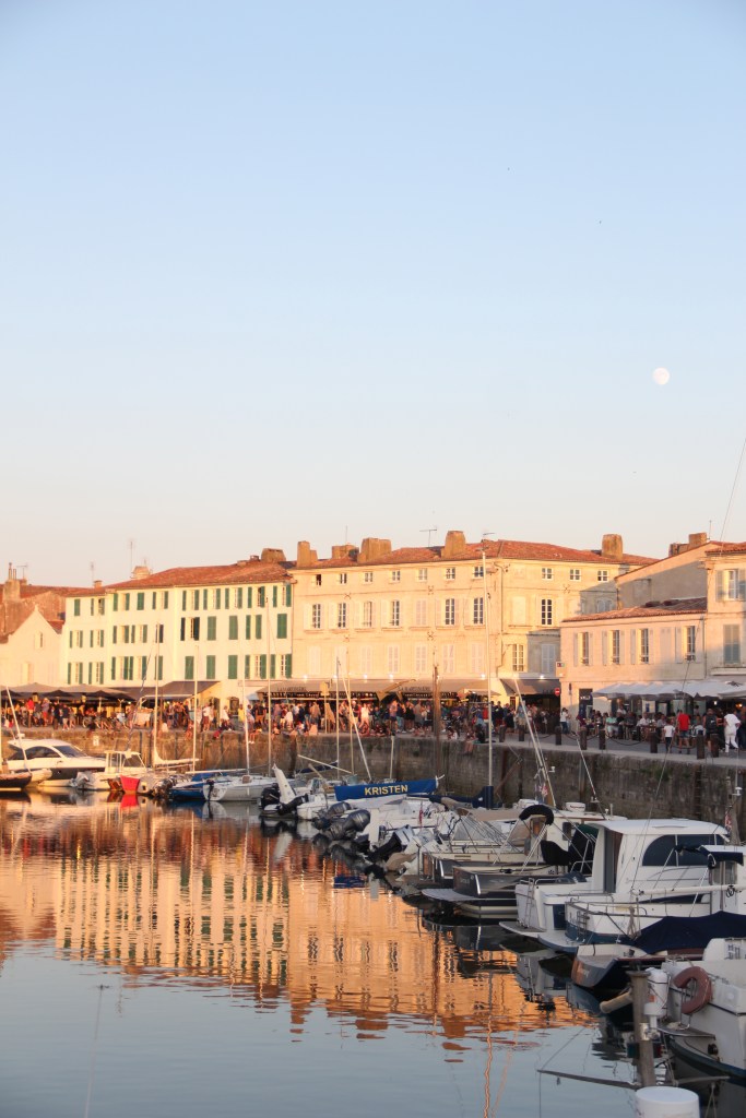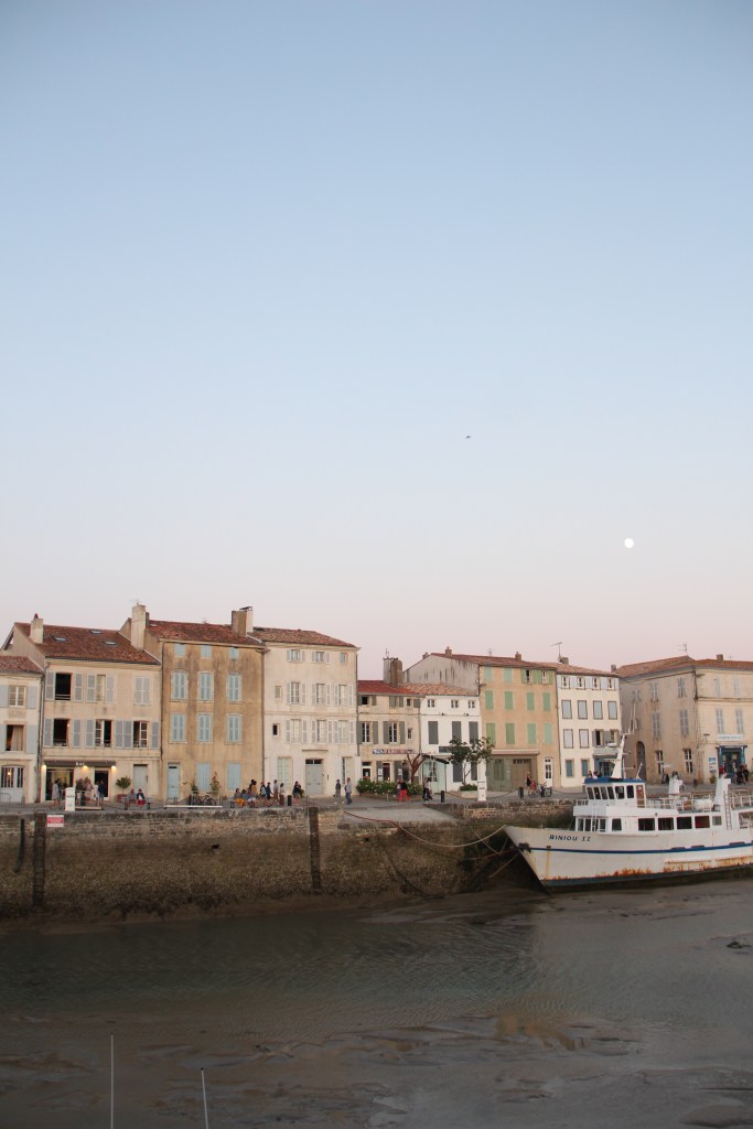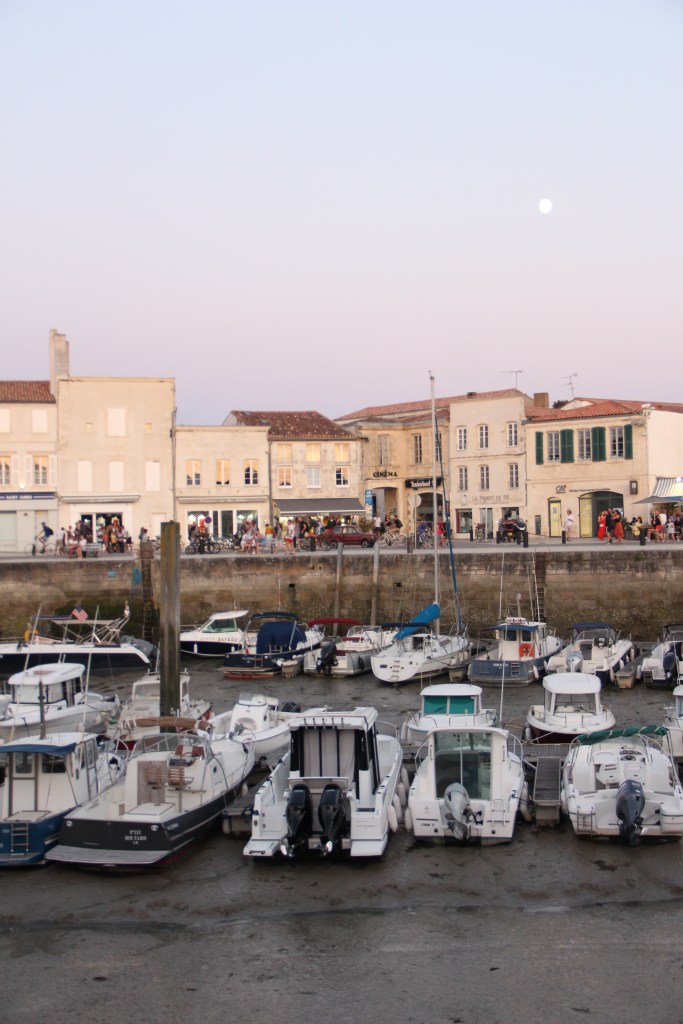Bastille Day, la Fête nationale, my birthday eve, and the day we arrived at La Rochelle airport on mainland France just after 5:30 in the evening. We retrieved our hands-free baggage from the belt and, shortly after that, boarded the bus over the bridge to the island. It took us about forty minutes with stops to get to Saint-Martin-de-Ré, the harbor town where we would base ourselves for the next two nights. The bus, while longer than a taxi, was easy. There’s absolutely no reason to have a car on Île de Ré; plus, the fees to take a car over the bridge, I read, are high. After getting off at our stop, it took us about another ten minutes to walk down the sidewalks into the center of town and to our Airbnb. Everything, instantly, was perfect. After putting our bags inside, we immediately went to the harbor to explore it and it’s îlot.