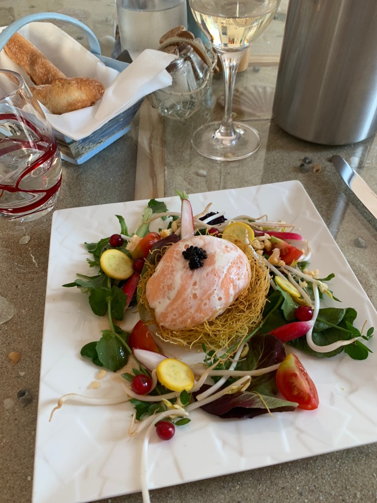 Dinner was amazing. We each ordered from the set menu. For me, the first course was an unreal salmon coated egg on a nest and salad with caviar, all fresh, local, and so good. Main course was sea bream with squid ink and veggies, and dessert was apricot tiramisu. We loved all of it. The setting, the laid back atmosphere, the handwritten menu, the casualness of it all. It’s one of my favorite places that I have ever eaten, anywhere in the world.
