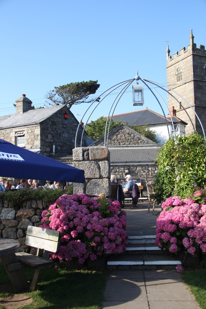 Zennor feels in the middle of nowhere. A tiny village, surrounded by green. There are a few buildings, the famous pub, not much else. But the pub! The pub has existed since 1279; it’s nearly 750 years old. And it’s such an absolutely lovely spot. Quiet, green, surrounded by giant pink hydrangea bushes. I had a St Ives orange gin and tonic and fell in love (it’s currently still my favorite gin). We sat outside, on a picnic table, in the sun, playing a pub trivia board game, just the two of us, for hours. Another round. A plate of hummus. We had absolutely no phone service. We wrote a postcard four our friend. We lost all track of time in the best way.