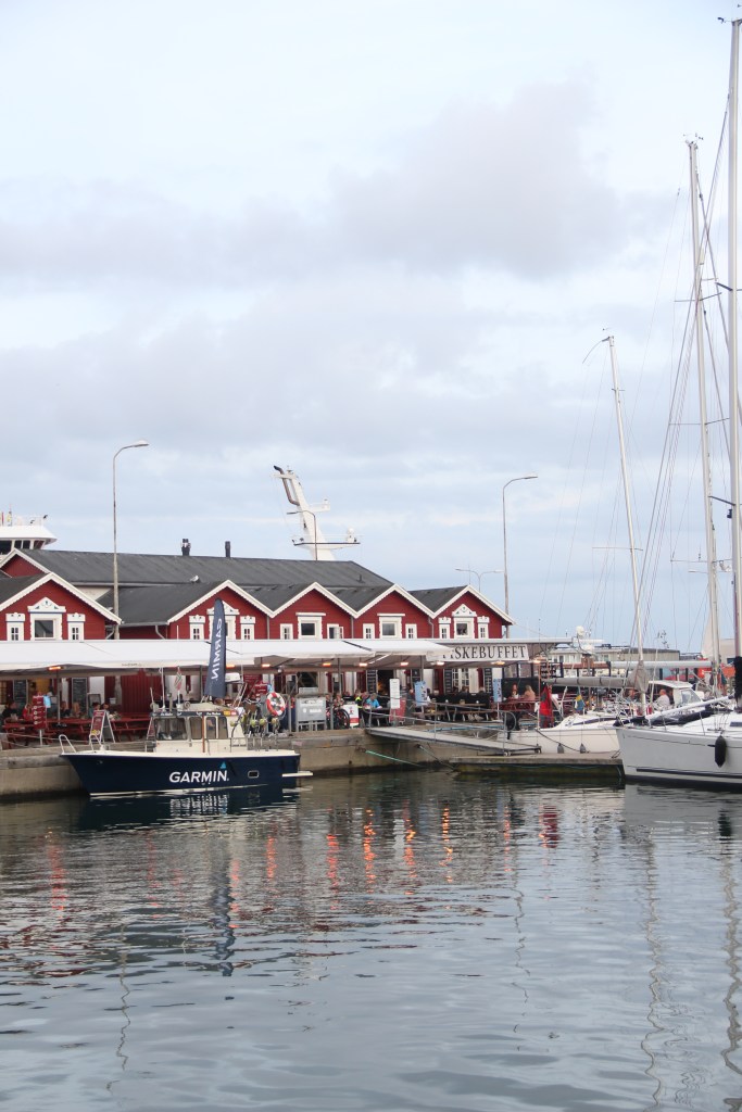 That evening, we ventured into town toward the harbor, past its industrial side. Giant ships, warehouses, and shipping containers. It was so quiet. Sailboats with flags from all over Scandinavia docked in the foreground, commercial vessels dotting the water behind. Red beach huts, like mini barns, line the waterfront in a row. Most boarded up, because it is long past the time of day when the fresh catch and friend seafood is sold from the windows during the day.