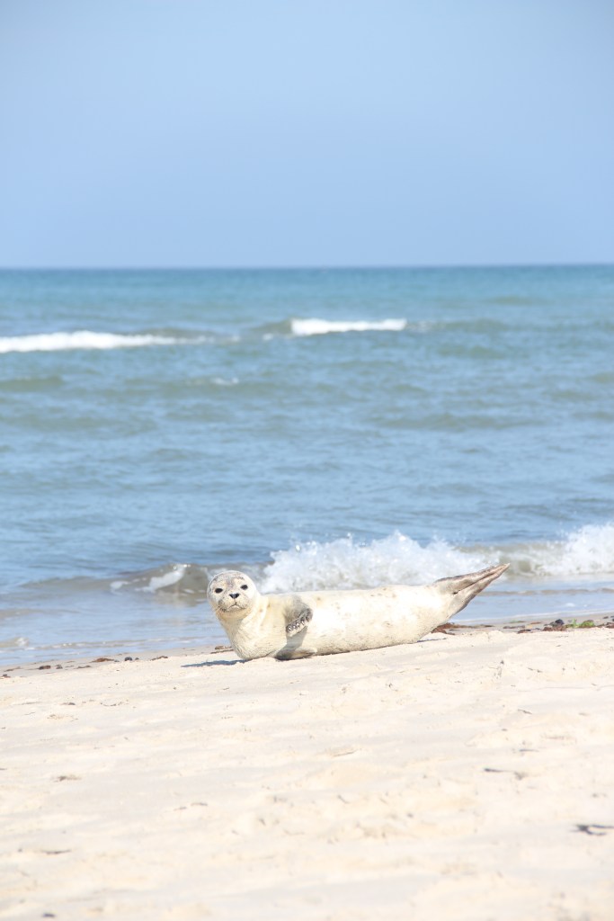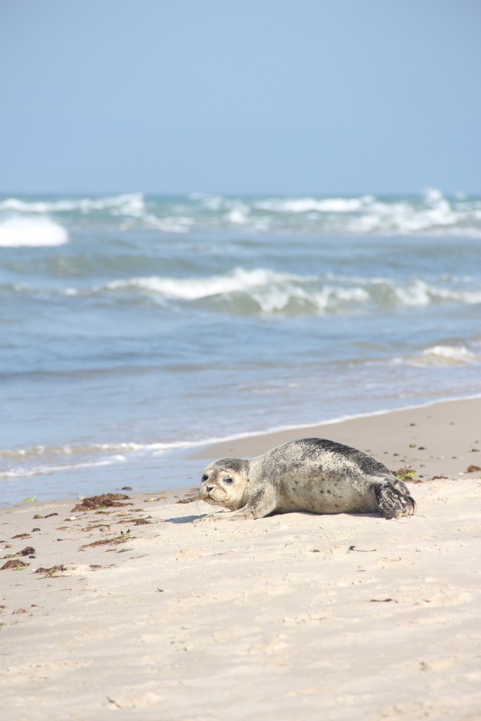 Grenen is white, blue, green, light, empty space, spotless sky. Cold sand, violent, clashing sea. A baby seal. A blanket in the sun. End of Denmark, end of the world.