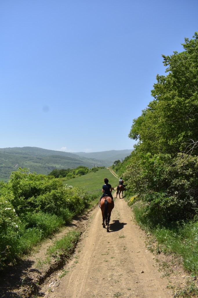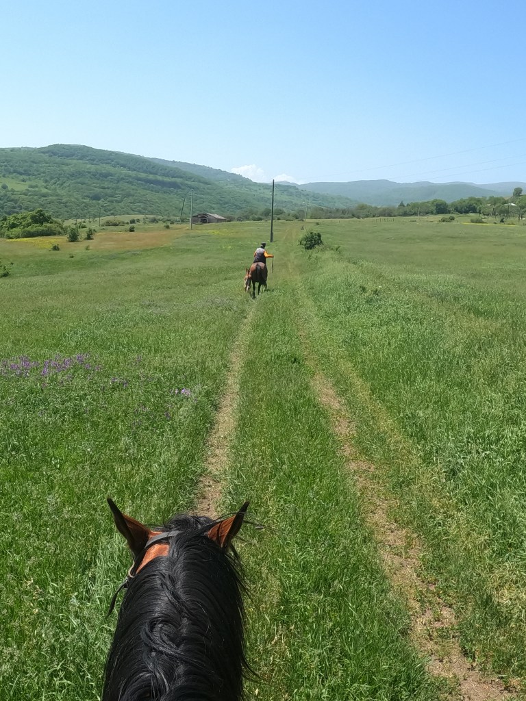 We’re speaking in broken English, broken Georgian. I am learning to ride in the yellow, red, purple, white wildflowers on green rolling hills. The lion dog running alongside, panting, disappearing into the forest, emerging from the stream, rolling in the grass, and the foal close to its mother up ahead. Hot sun and fresh air, on the back of a horse for the first time in my adult life in this postcard scene, pausing to breathe, reminding myself that I am really here. I could not have planned this, but here I am with a new friend; a lesson in the Georgian art of trust and letting go.