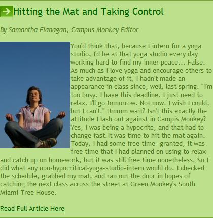 As much as I love yoga and encourage others to take advantage of it, I hadn’t made an appearance in class since, well, last spring. “I’m too busy. I have this deadline. I just need to relax. I’ll go tomorrow. Not now. I wish I could, but I can’t.” Ummm wait? Isn’t this exactly the attitude I lash out against in Campus Monkey? Yes, I was being a hypocrite, and that had to change fast.