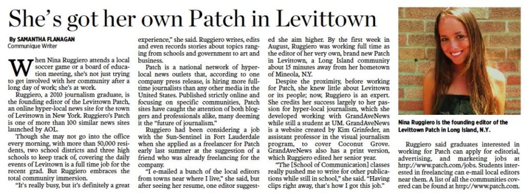 Ruggiero, a 2010 graduate of the University of Miami School of Communication and former editor for the print version of GrandAveNews, is the founder and editor of the Levittown Patch, an online hyper-local newspaper for the town of Levittown in New York. Though she may not go into the office every morning, with over 50,000 residents, two school districts, and three high schools to keep track of, covering the daily events of Levittown is a full time job for the recent grad. But Ruggiero, a former editor for the print version of GrandAveNews, embraces the total community immersion.